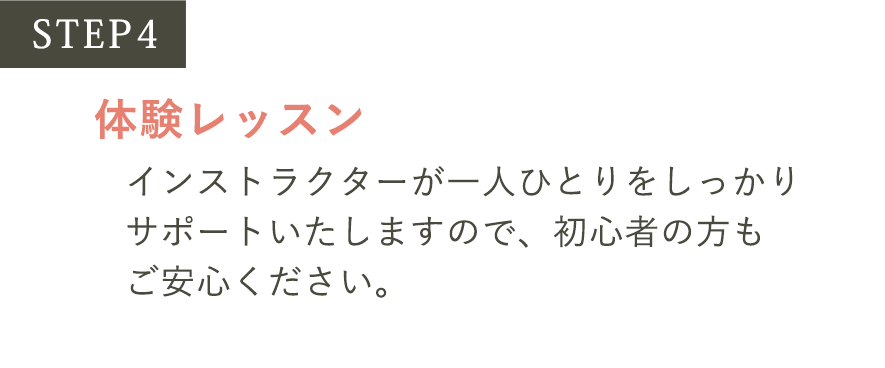 まずは体験レッスンをお試しいただき、その後のカウンセリングにて、入会手続きをおこなっていただけます。