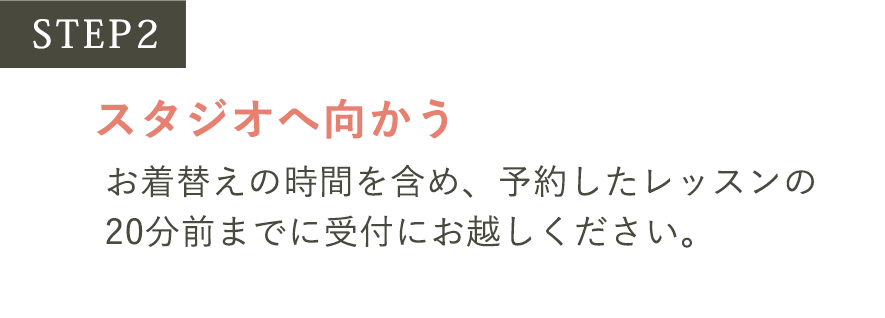 レッスン開始の20分前までにご来店ください。お着替え、施設利用のご説明をさせていただきます。