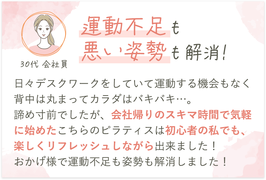 DAYS PILATESでは初心者コースから上級者コースまで幅広いレッスンを用意しています。 分からないことがあっても当店インストラクターが丁寧にお教えしますので、安心してご参加ください。