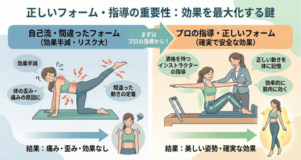どちらを選ぶにせよインストラクターの指導を受け、正しいやり方を学ぶことが効果を最大化する重要なポイントです。