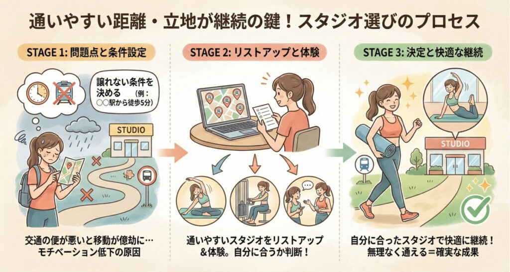 ピラティスに限らず、自身にとって通いやすい立地にあることは非常に大切です。