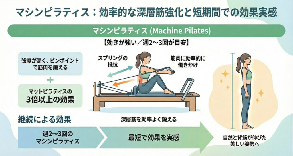 マットピラティスに比べ効率よく深層筋を鍛えることができるため、最短で効果を実感したい方にお勧めです。