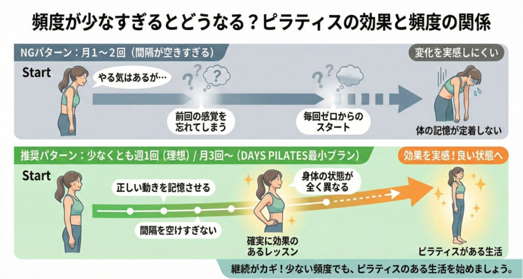 ピラティスの効果を考えるとき、「週何回通えばいいの?」という質問をよく受けますが、実は頻度だけを見ても答えは出ません。