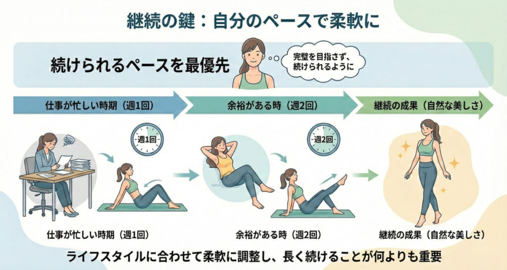 仕事が忙しい時期は週1回、余裕がある時は週2回というように、ライフスタイルに合わせ柔軟に調整しながら続けることが何よりも重要です。