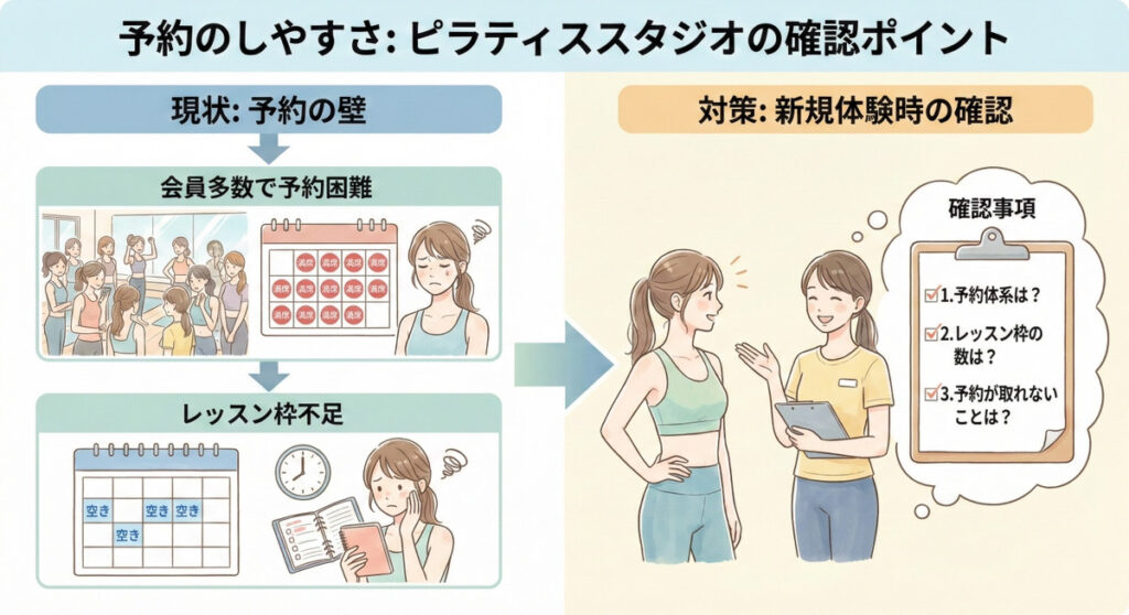 新規体験に行った際にあらかじめ、「どのような予約体系をとっているのか」、「レッスンの枠はどれくらいあるのか」「予約が取れないということはあるか」と確認事項をまとめておくのがいいでしょう。